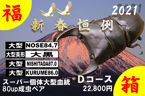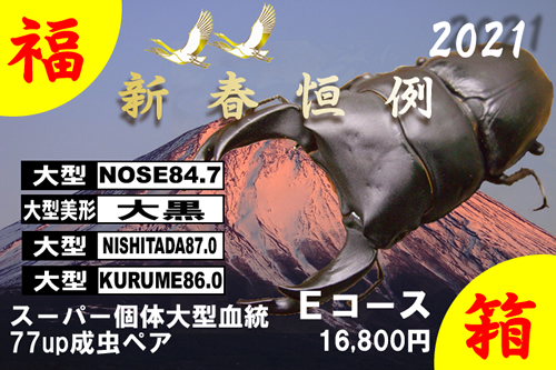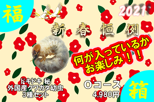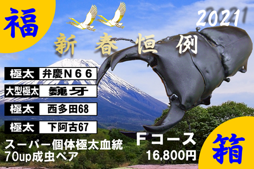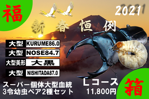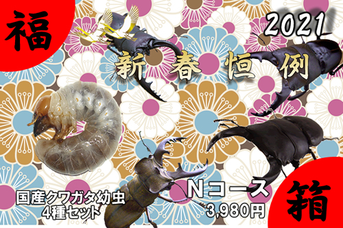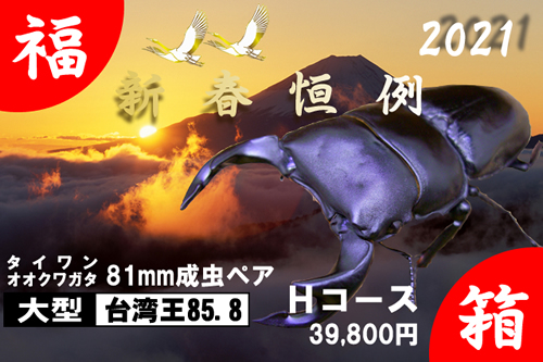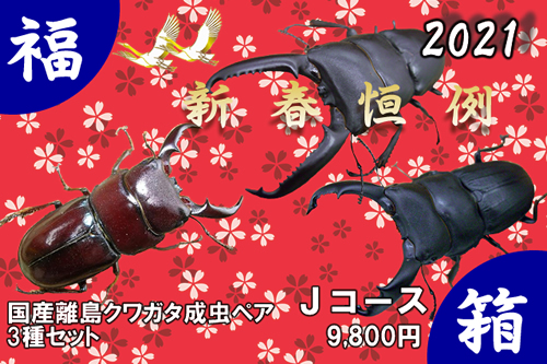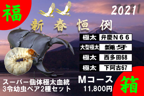 | カブトムシ、クワガタムシ、オオクワガタ、ヘラクレス、アトラスオオカブト、コーカサスオオカブト、ゾウカブト、シロカブト、ヒラタクワガタ、ノコギリクワガタ ミヤマクワガタ、タランドゥス、グランディスオオクワガタ、アンテ(アンタエウスオオクワガタ)、ホペイオオクワガタ、ツヤクワガタ、フタマタクワガタ、ニジイロクワガタ ホソアカクワガタ、サタン、リッキー、ギラファ、マンディブラリス、その他外国産カブト、その他外国産クワガタ 幼虫・成虫ペア |