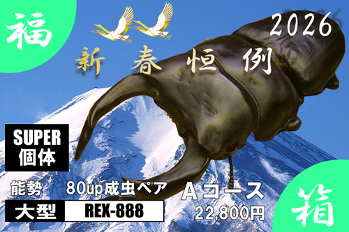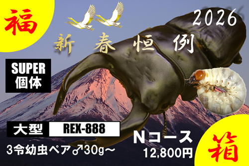 ZU-138 | Nコース | SUPER個体【REX-888】血統3令幼虫ペア♂30g〜 | 12800円(税込) |