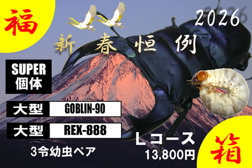 お一人様 1箱まで 毎年人気のスーパー個体大型血統3令幼虫ペア2種セットです。「REX−888」血統 + 「GOBLIN-90」血統の2種です。 |