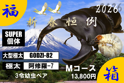 お一人様 1箱まで 毎年人気のスーパー個体極太血統3令幼虫ペア2種セットです。「阿修羅-7」血統 + 「GODZI-82」血統の2種です。 |